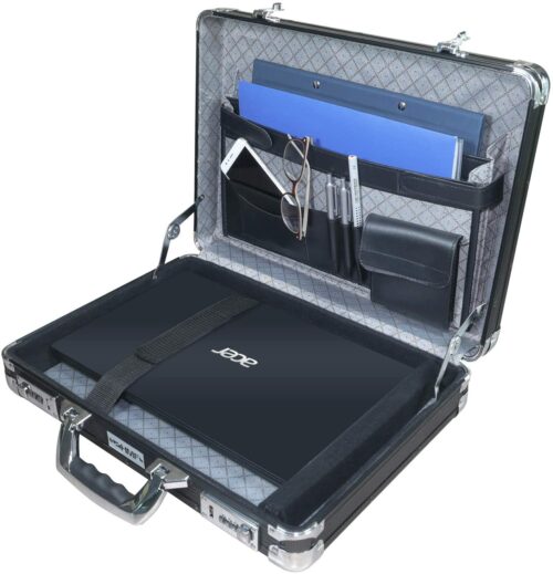 Der Aluminiumkoffer besitzt ein geräumiges Innenfach, welches sich dank der verschiebbaren Trennwand individuell aufteilen lässt. So finden auch Gegenstände wie Laptops bis zu 17,3 Zoll im Koffer Platz. Durch den gepolsterten Innenraum wird der Laptop zusätzlich geschützt.