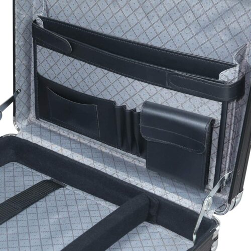 Die dehnbaren Fächer aus Kunstleder im Deckel bieten Platz für Ihre Unterlagen und sind bei Bedarf erweiterbar. Außerdem stehen noch verschiedene kleine Fächer für elektronische Kleingeräte, Visitenkarten und Stifte zur Verfügung.