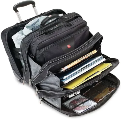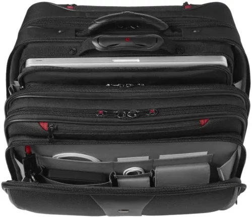 Das Flaggschiff der Wenger Laptoptrolley-Collection beinhaltet den gepolsterten Laptop-Trolley, ein Comp-U-Roller mit gepolstertem Fach, das ein Laptop bis zu 17-Zoll schützt, und einer herausnehmbaren Laptoptasche, welche ein Laptop bis zu 15,6-Zoll aufbewahren kann.